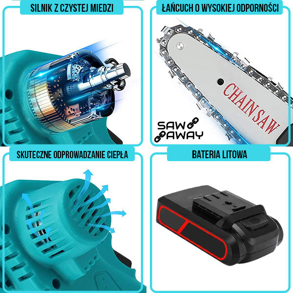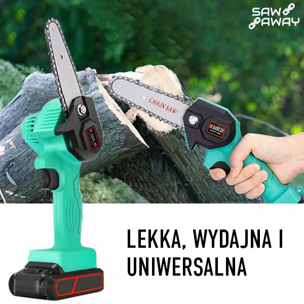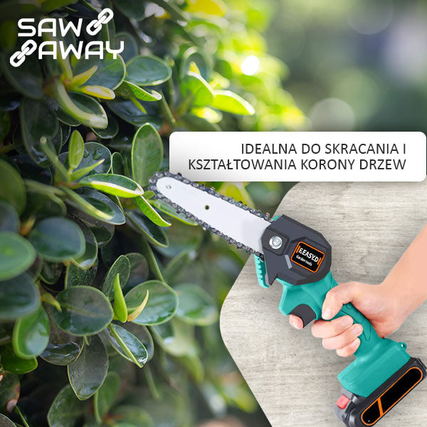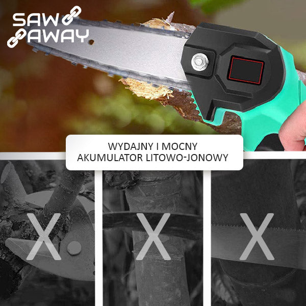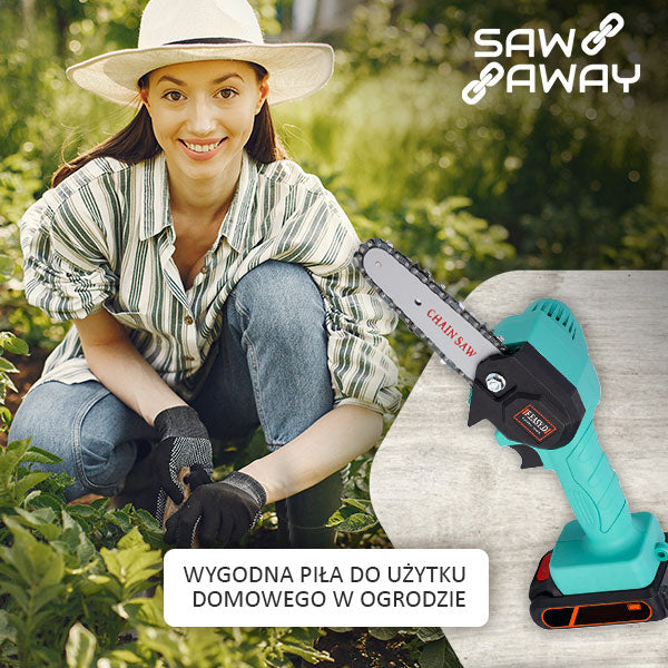 SawAway™ to poręczna piła na akumulator która zapewni, że Twoje drzewa i otoczenie będą zawsze idealnie zadbane. Świetnie nadaje się do skracania, kształtowania korony drzew i innych prac domowych w ogrodzie. Wyróżnia się ergonomicznie zaprojektowaną rączką, która zapewnia podczas pracy lepszy chwyt oraz umożliwia łatwe przenoszenie. SawAway™ jest łatwa w użyciu i utrzymaniu. Składa się z zabezpieczenia przed przeciążeniem oraz specjalnej prowadnicy łańcucha, która nie wymaga smarowania, a akumulator zapewnia szybkie ładowanie. Piła ręczna jest odpowiednia dla każdego, ponieważ wysokiej jakości łańcuch i niezwykle mocny silnik zapewniają precyzyjne, wydajne i szybkie usuwanie gałęzi. SawAway ™ bez wątpienia stanie się Twoim ulubionym narzędziem we wszystkich pracach ogrodniczych.