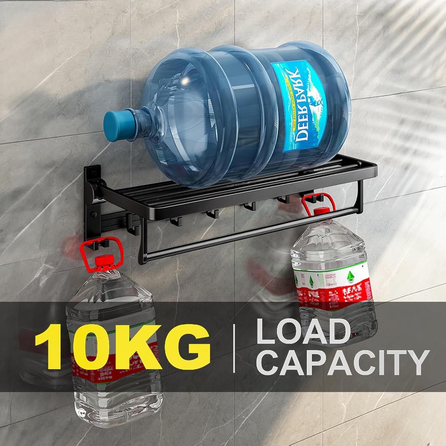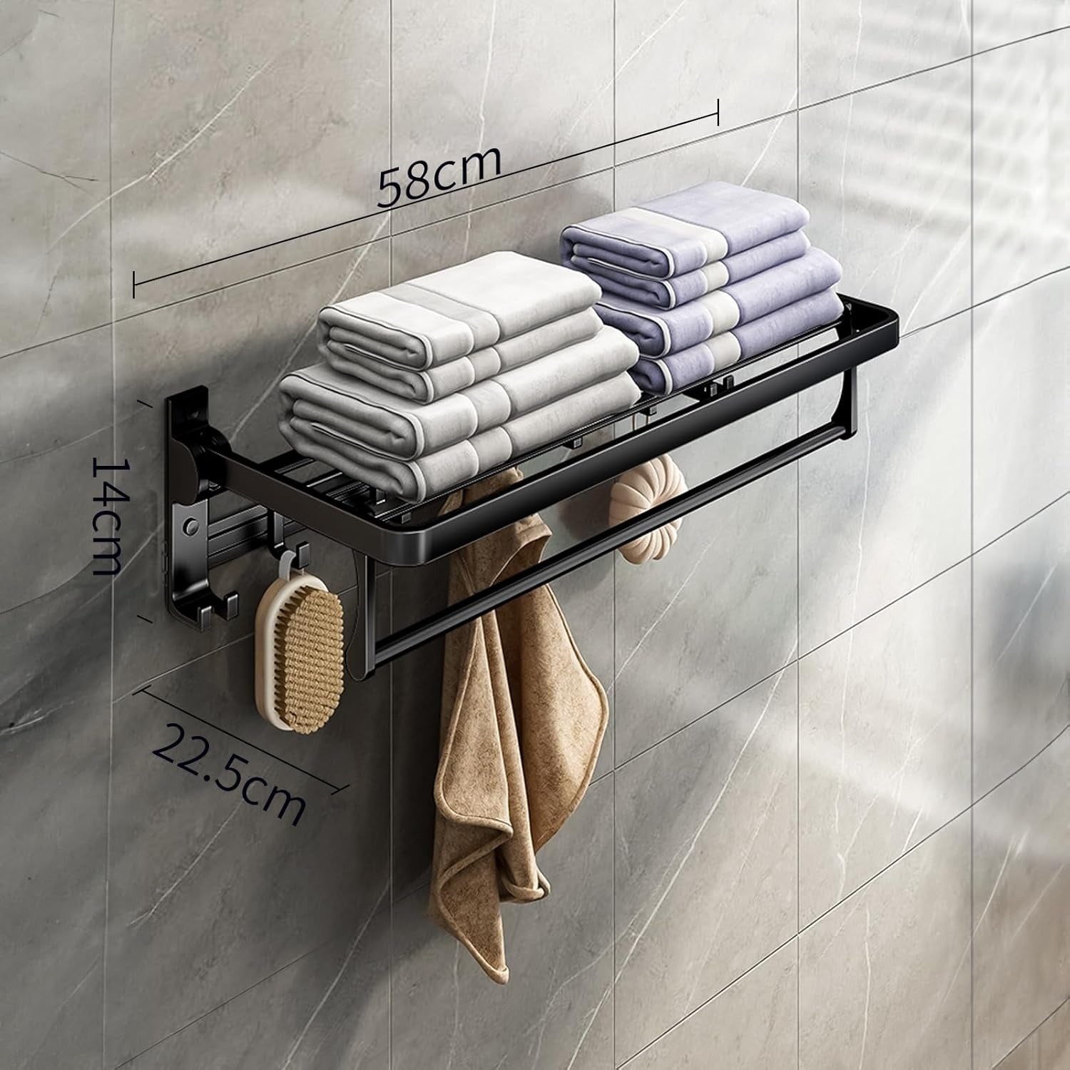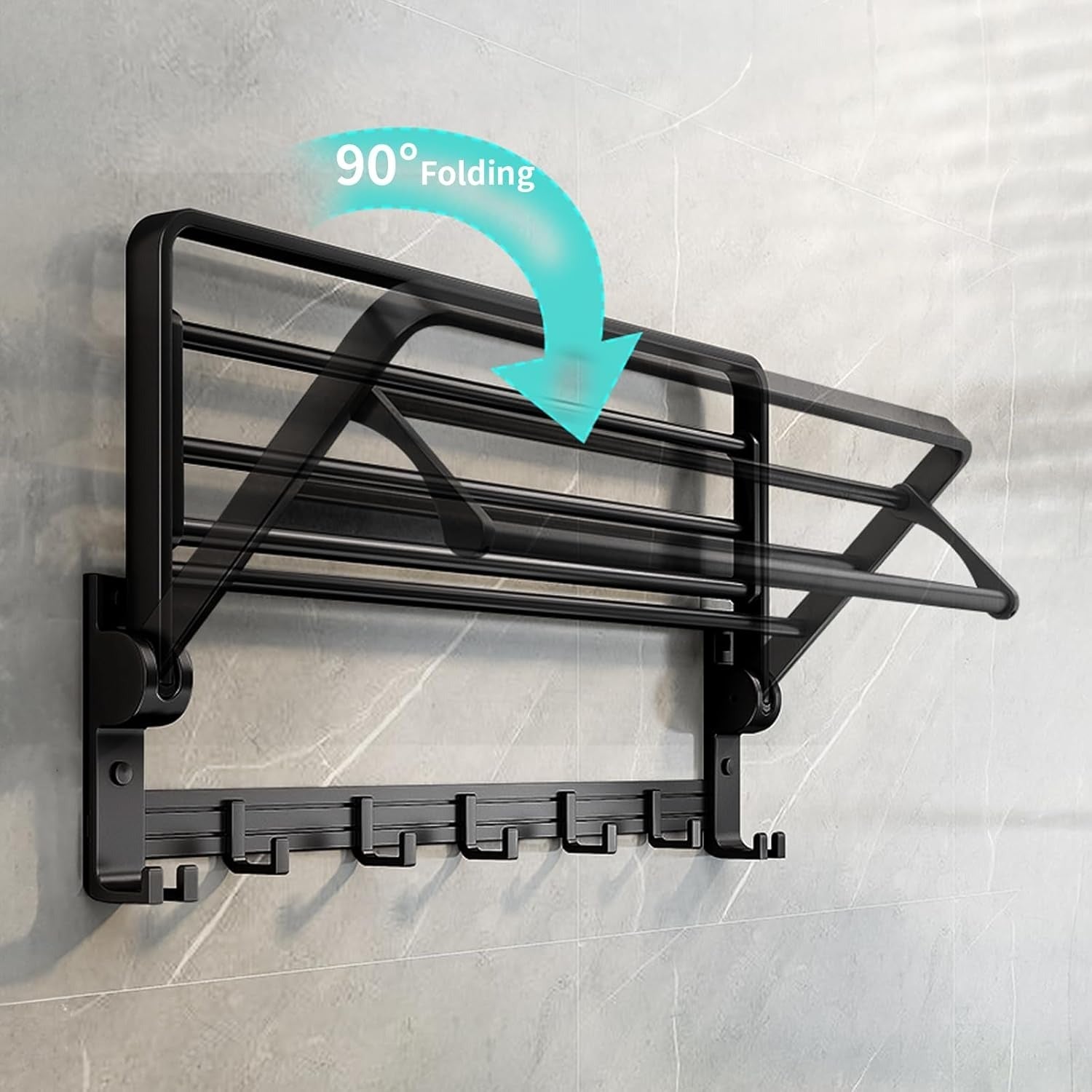 Składany, matowoczarny wieszak na ręczniki, z samoprzylepnym mocowaniem bez wiercenia, wyposażony w składaną półkę i siedem wyjmowanych haczyków, co umożliwia praktyczną organizację w łazience lub kuchni; wykonany z odpornego na rdzę aluminium, oferuje dużą przestrzeń o długości 58 cm i nowoczesny design z zaokrąglonymi krawędziami zapewniającymi bezpieczeństwo.