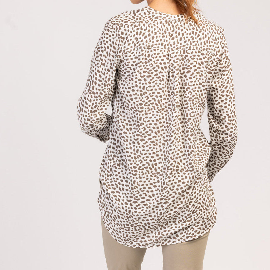Ta damska bluzka z długim rękawem w wyrafinowany czarno-biały wzór łączy elegancję i wygodę. Wykonana z miękkiej wiskozy, jest cudownie gładka i oddychająca, zapewniając komfort przez cały dzień.